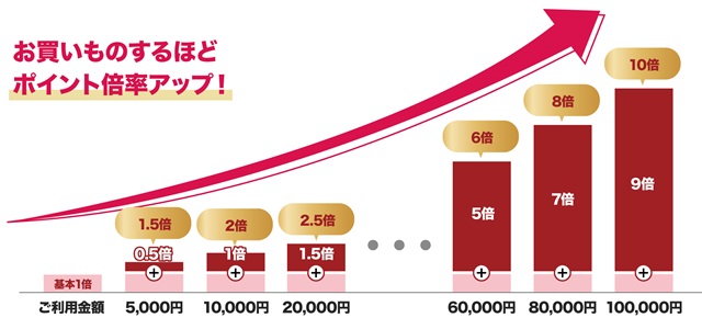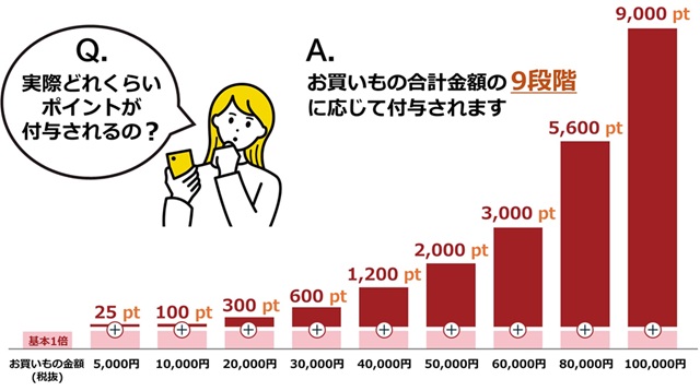 キャンペーン期間中に合計8万円(税抜)のお買いものなら6,400pt(基本800pt + キャンペーン分5,600pt)、合計10万円(税抜)のお買いものなら10,000pt(基本1,000pt + キャンペーン分9,000pt)が付与されます。合計8万円(税抜)から合計10万円(税抜)に満たない合計9万円(税抜)のお買いものでは6,500pt(基本900pt + キャンペーン分5,600pt)が付与されます。